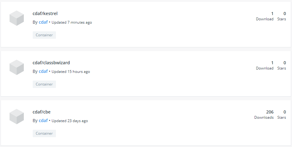 Each component or micro service is delivered to the central catalogue, in this example, Docker Hub, but this could be any Open Container Initiative (OCI) Registry, either public or private.