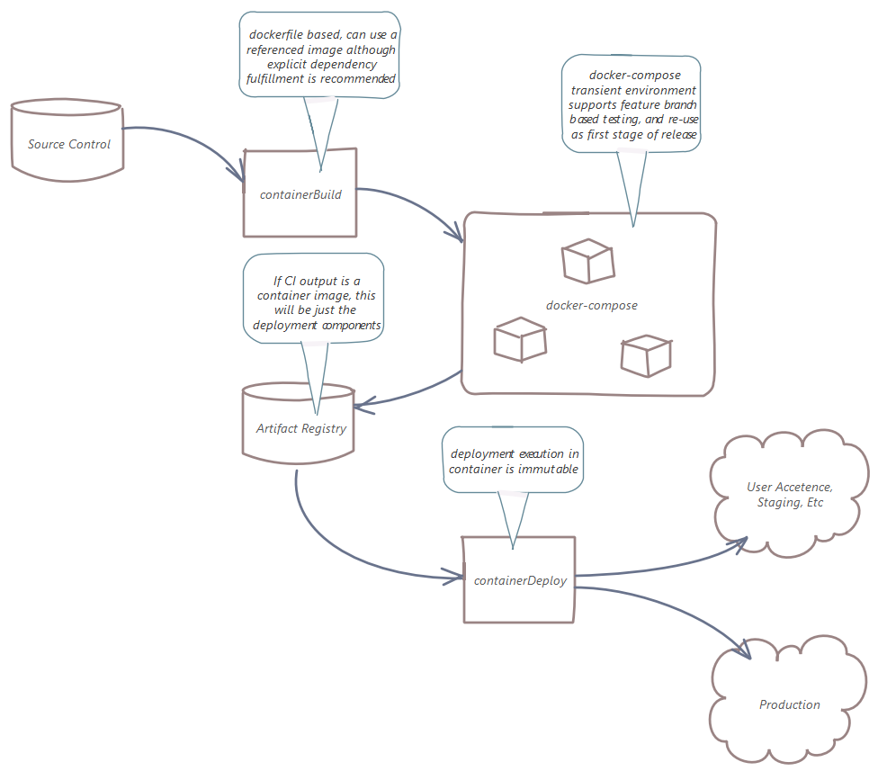 Each feature can be utilised independently. The containerBuild uses a volume mount to supply the resulting artefacts to the pipeline for upload, while containerDeploy is immutable, being supplied the artefacts as part of the disk image.