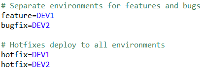 The CDAF extension (2.4.5) allows for the targeting of one or more environments, based on pattern match within branch name (definition file is feature-branch.properties).